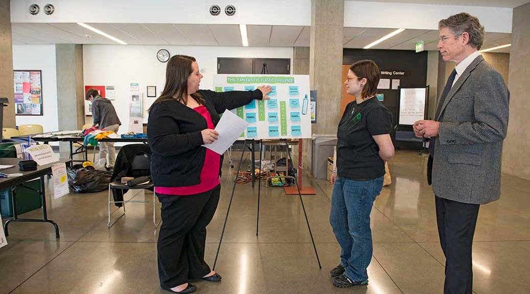As part of the events marking Earth Week 2014, our Leadership Academy team — Marjorie Gray, Communications Consultant in the Center for Excellence; Dan Murphy, Grants Specialist in Resource Development; and Lea Wasson, Director of Student Housing — challenged EvCC students (and staff!) to see how they fared on the “Fantastic Plastic Challenge” quiz.